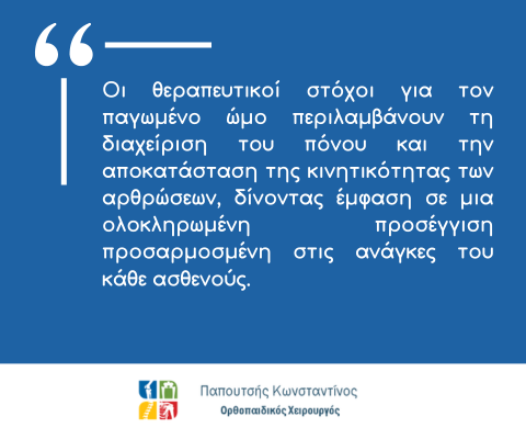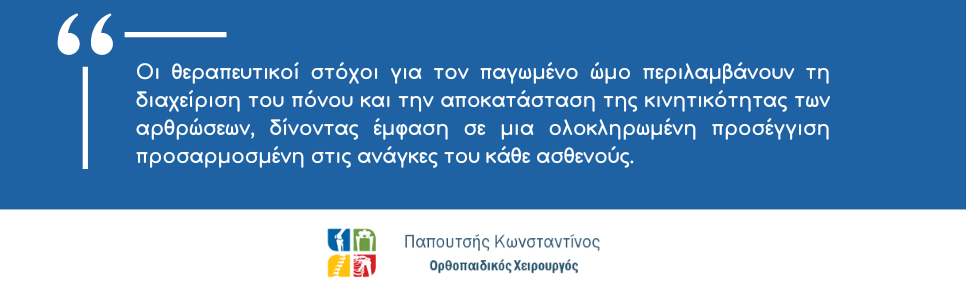 Οι θεραπευτικοί στόχοι για τον παγωμένο ώμο περιλαμβάνουν τη διαχείριση του πόνου και την αποκατάσταση της κινητικότητας των αρθρώσεων, δίνοντας έμφαση σε μια ολοκληρωμένη προσέγγιση προσαρμοσμένη στις ανάγκες του κάθε ασθενούς. Οι θεραπευτικές επιλογές κυμαίνονται από συντηρητικά μέτρα έως χειρουργικές επεμβάσεις.